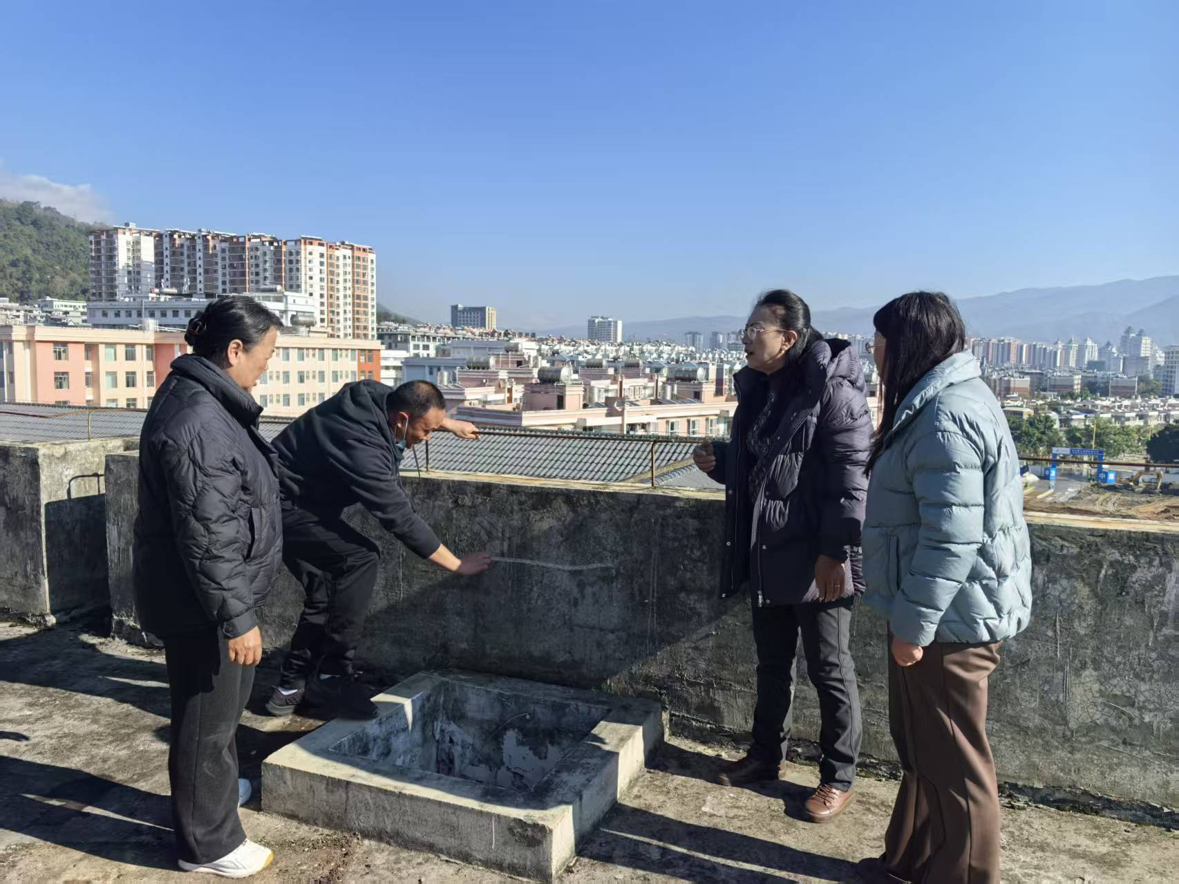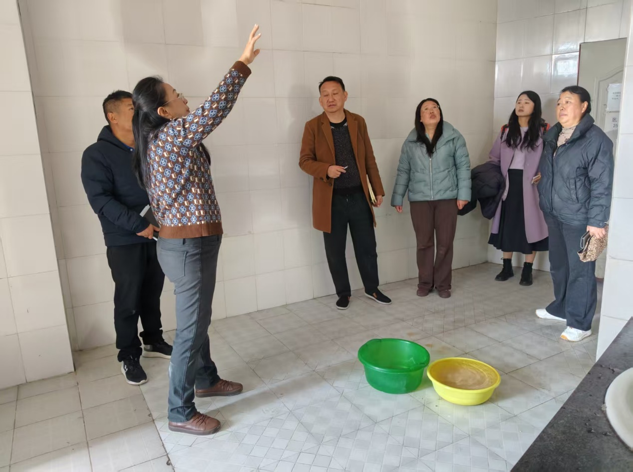 检查组严格遵循“不放过一处隐患、不漏过一个细节”的原则,先后对图书馆各楼层阅览区、卫生间、四楼平台及公共区域进行全面细致排查,重点围绕建筑结构安全、设施设备运行、消防系统保障等方面展开检查。检查中发现三类突出安全隐患:一是全馆卫生间普遍存在管道渗漏与地面积水问题,影响使用并存在卫生与结构隐患;二是四楼平台排水不畅,雨天积水严重,已引发渗透现象;三是多处公共区域墙面出现空鼓、开裂甚至脱落,存在高空坠物风险。校领导每到一处均详细询问情况、分析成因,并要求责任部门立即记录、限期溯源、彻底整改。