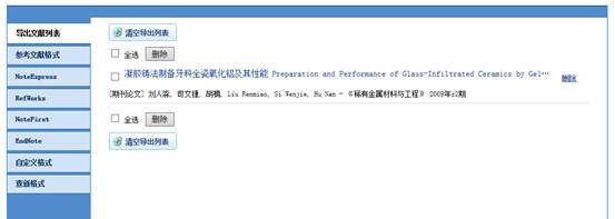 提供下载全文、查看全文、原文传递等功能;可按参考文献格式、NoteExpress、RefWorks、NoteFirst、EndNote、自定义格式、查新格式导出文献(见图18)。